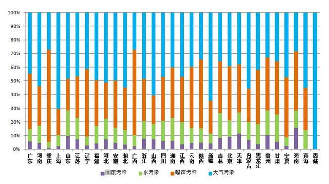 從各省舉報汙染類型占比來(lái)看,上海、新疆大氣汙染舉(jǔ)報在當地占比較高,占比(bǐ)高於全國平均水平13個百分點,其中上海(hǎi)主要反映工業廢氣和油煙(yān)問題,新疆主要(yào)反映惡臭異味問題(tí)。重慶、廣西噪(zào)聲(shēng)汙染舉報在當地(dì)相(xiàng)對突出,占比超過全國平均水平近20個百(bǎi)分點,兩地主要反映建築施工噪聲問題。甘肅(sù)、山東、貴州、吉林水(shuǐ)汙染舉報在當地占比較高,超過全國平均水平約5.5個(gè)百分點。