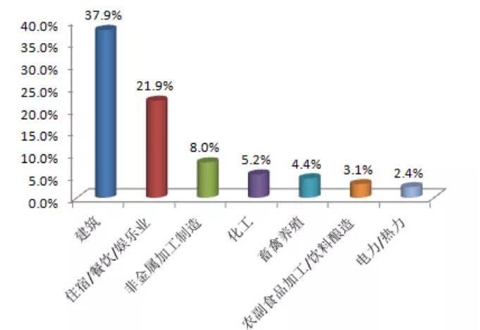從行業類型來看,11月公眾反映***集中的行業是建築業,占37.9%,其次為住宿餐飲娛樂業和非金屬加(jiā)工製造,分別占21.9%和8.0%。其中,建築業占比環比下降約11個百分點,非金屬加工(gōng)製造業和化工業舉報占比環比(bǐ)分別約上升2.1和1.4個百分點。此外,電力熱力(lì)業占(zhàn)比排名攀升至第7名(míng),超過(guò)垃圾(jī)處理業。