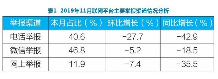 2019年11月聯(lián)網平台主要舉報渠道情況分析